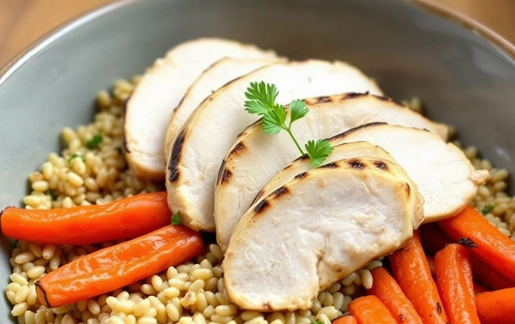 - Assemble bowl with farro base, carrots, and chicken on top.